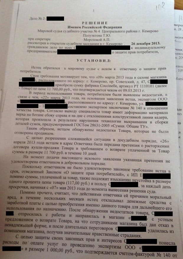 В 2013 году клиент приобрела в магазине женскую кожаную сумку марки Coccinelle по цене 11 700 руб. При использования выявились недостатки (брак) в связи с чем клиент попыталась вернуть сумку в магазин, однако, ей было отказано.