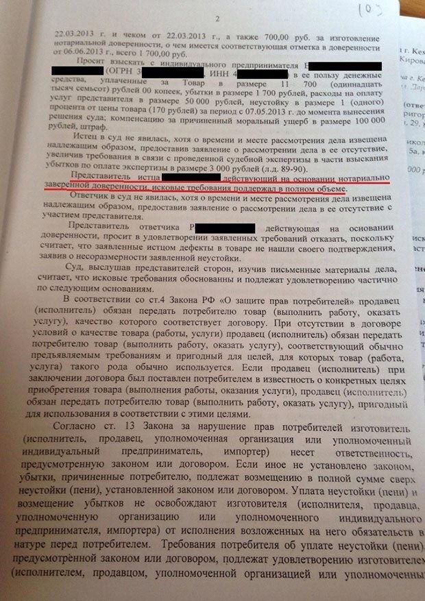 С привлечением специалиста была проведена досудебная экспертиза, которая подтвердила наличие заводского недостатка (брака) после чего в адрес индивидуального предпринимателя, которому принадлежал магазин, была подана претензия. Поскольку претензия была оставлена без удовлетворения – было составлено исковое заявление и подано в мировой суд. В рамках процесса судебная экспертиза подтвердила наличие брака и обоснованность претензий со стороны истца.