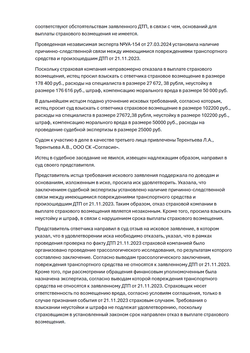 Страховая компания отказала клиенту в выплате, утверждая, что повреждения автомобиля не соответствовали обстоятельствам ДТП. Наша задача была доказать причинно-следственную связь и незаконность отказа. В результате суд не только признал случай страховым, но и взыскал в пользу клиента полагающееся возмещение, неустойку, штраф, компенсацию морального вреда и судебные издержки.