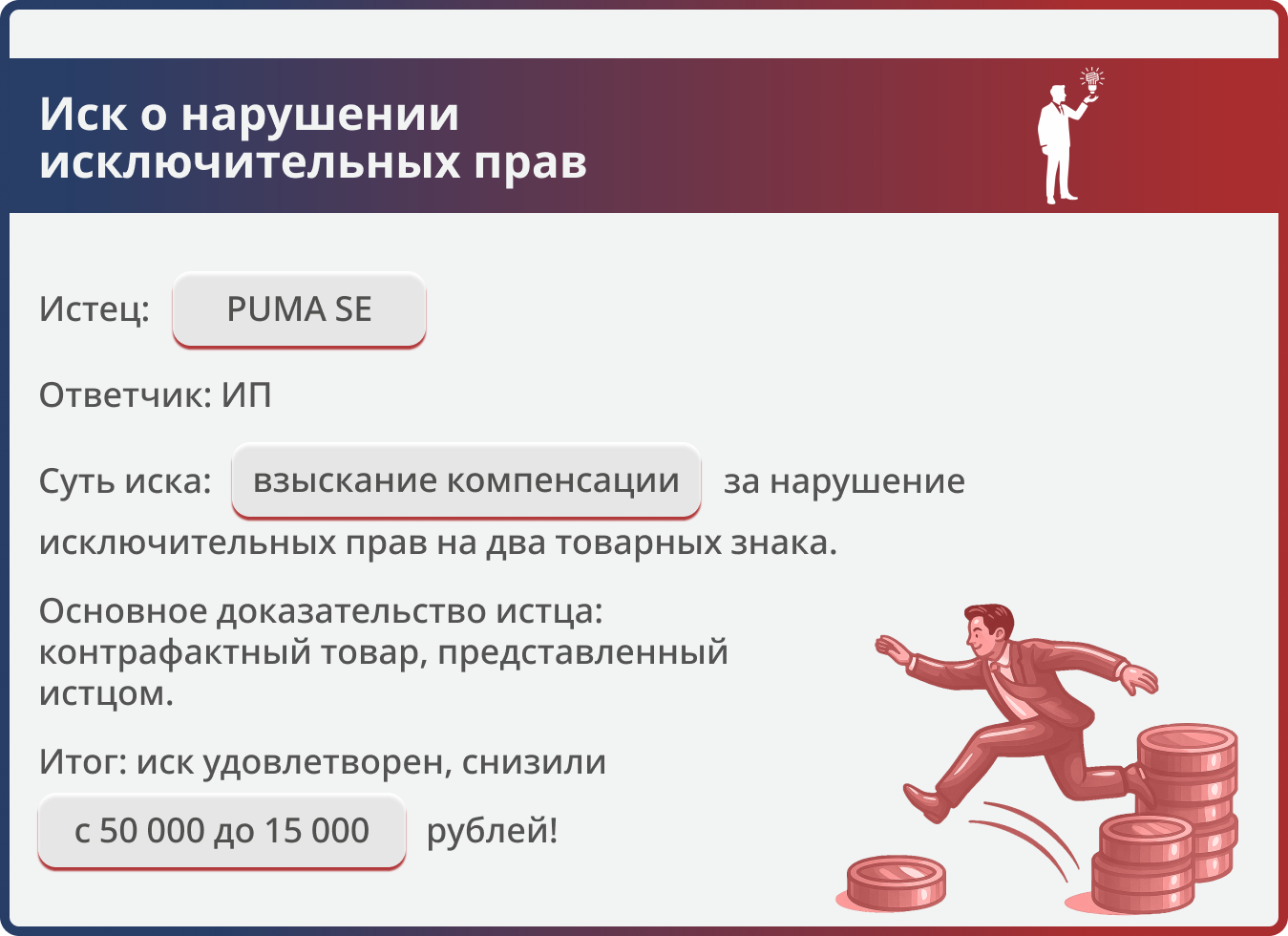 Это дело — наглядный пример того, что даже при нарушении прав крупнейших мировых брендов возможна эффективная защита. Благодаря грамотному применению норм материального права и убедительной аргументации удалось добиться снижения компенсации на 70 %.