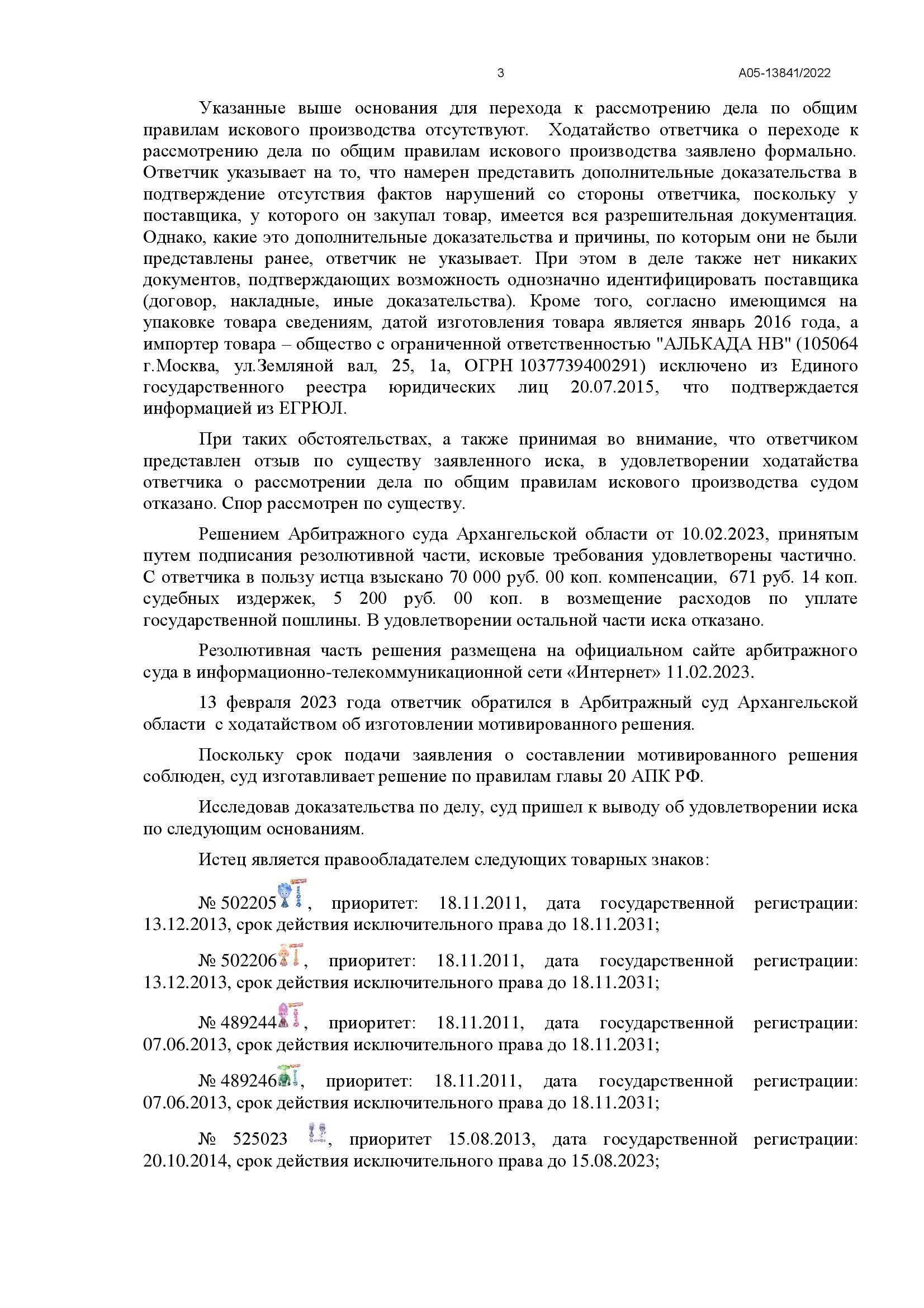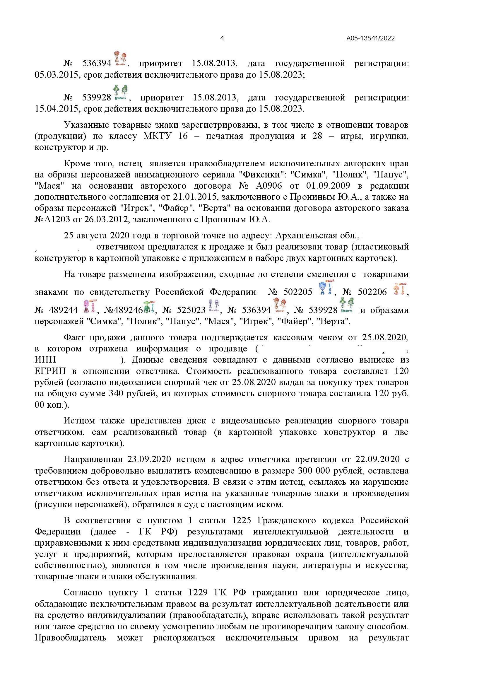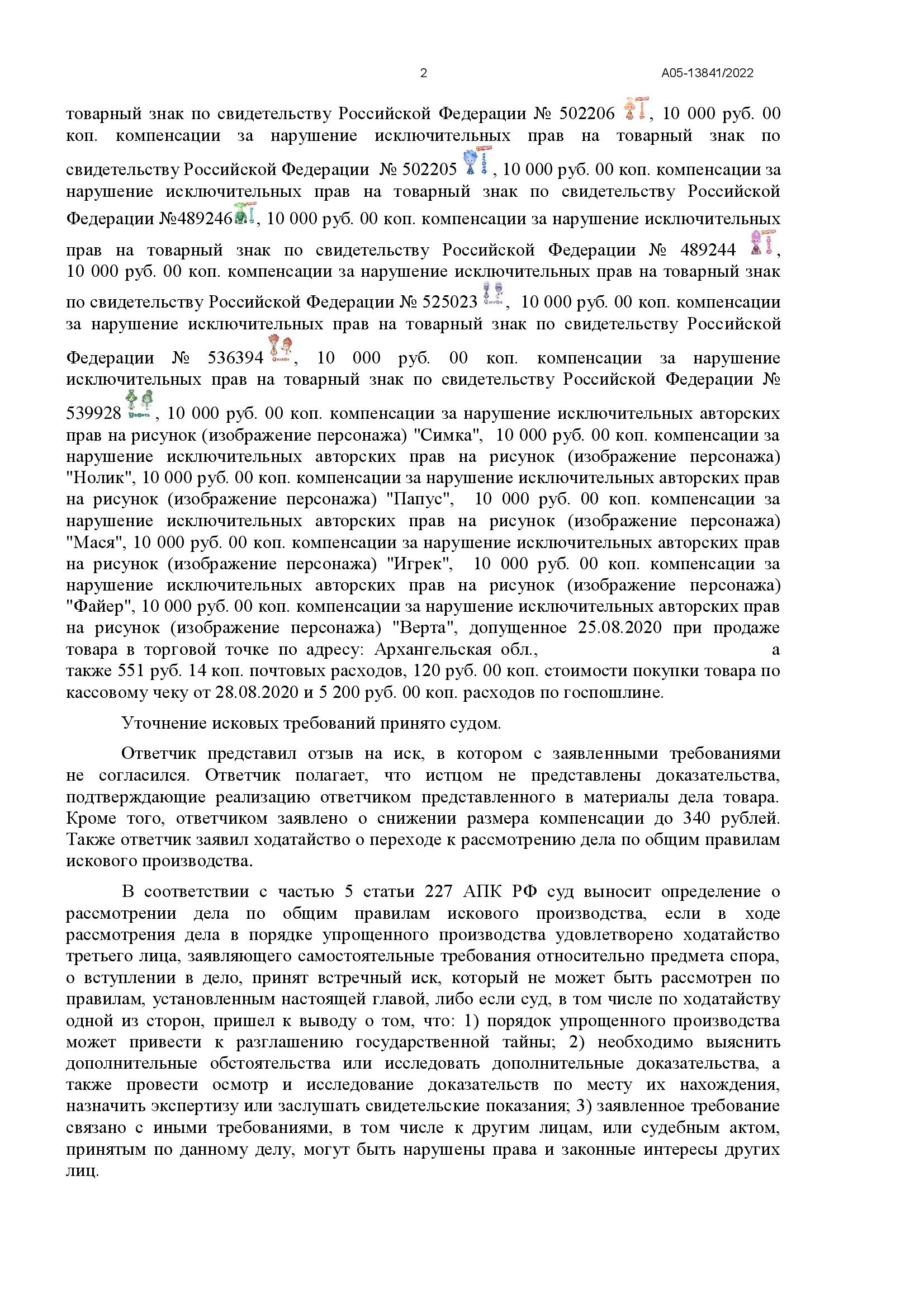 Дело рассматривалось в Арбитражном суде Архангельской области в порядке упрощённого производства. Истец (АО «Аэроплан») обратился в суд с иском к ИП о взыскании 140 000 руб. компенсации за нарушение исключительных прав на 7 товарных знаков и 7 рисунков персонажей анимационного сериала «Фиксики» («Симка», «Нолик», «Папус», «Мася», «Игрек», «Файер», «Верта»). Основание — продажа в торговой точке в г. Няндома пластикового конструктора в картонной упаковке, на котором размещены указанные изображения. Ответчик представил отзыв, просил снизить компенсацию до 340 руб. и заявил ходатайство о переходе к общим правилам искового производства, но суд отказал, рассмотрев дело в упрощённом порядке.