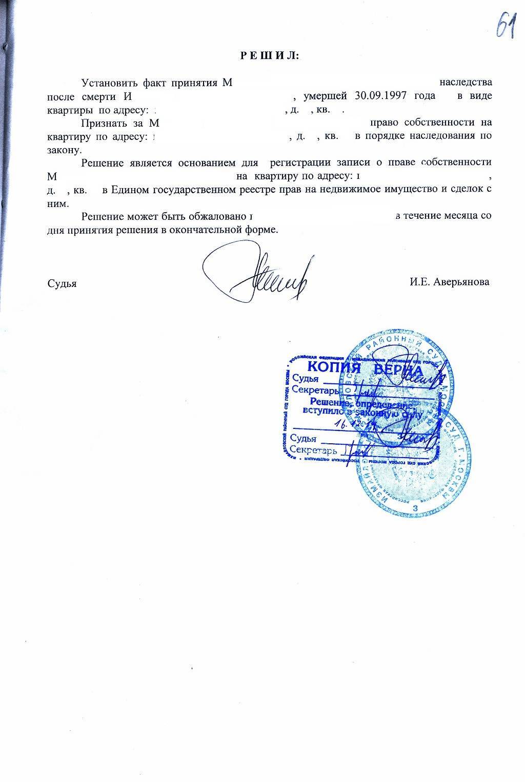 Решение об установлении факта принятия наследства