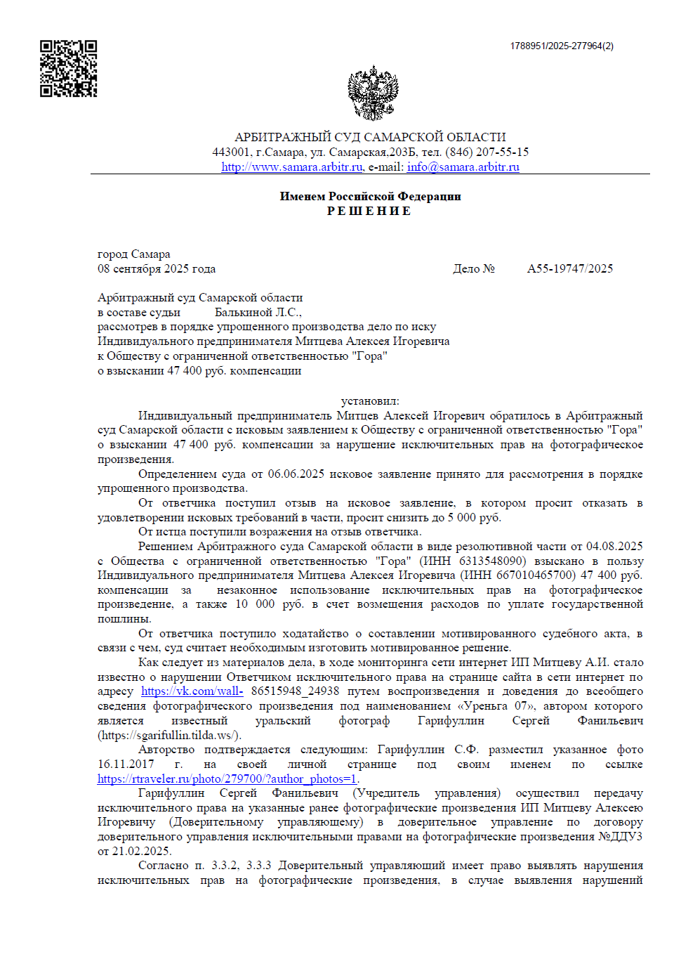 Однако популярность фотографий неизбежно приводит к рискам — изображения нередко используют без разрешения. Чтобы защитить свои права и сохранить контроль над собственным творчеством, Сергей обратился к нам. За юридическое сопровождение отвечал Егоров Андрей, который помог зафиксировать нарушения, подготовить необходимые документы и выстроить стратегию защиты.
