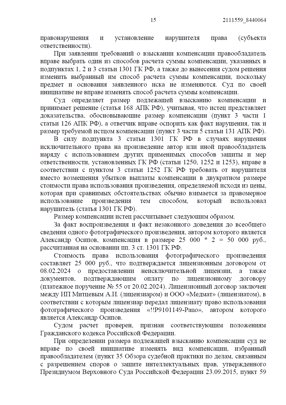 - Мы отказались от минимальных сумм и потребовали компенсацию в двукратном размере стоимости права использования. В качестве доказательства реальной цены была представлена рыночная сделка — лицензионный договор на это же фото, оплаченный сторонним заказчиком.