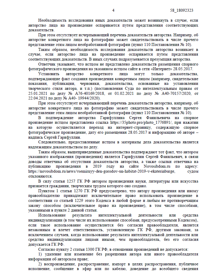Нарушение было зафиксировано автоматизированной системой «Цифровое Око»: на сайте медицинской компании ООО «МТО «СТОРМОВЪ» в новостной статье использовалось фотографическое произведение «с башни Исеть 13». Мы собрали доказательства, подтвердили авторство фотографа Сергея Гарифуллина и направили иск в Арбитражный суд Московской области. Дело рассматривалось в порядке упрощённого производства.