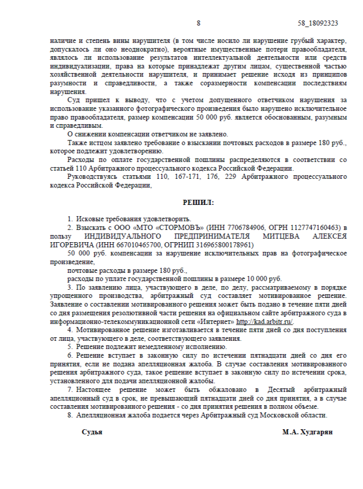 Взыскать компенсацию с компании «МТО СТОРМОВЪ» за нарушение исключительных прав на фотографию, размещенную на сайте ответчика без разрешения правообладателя, а также подтвердить право требовать выплаты компенсации в интересах Автора.