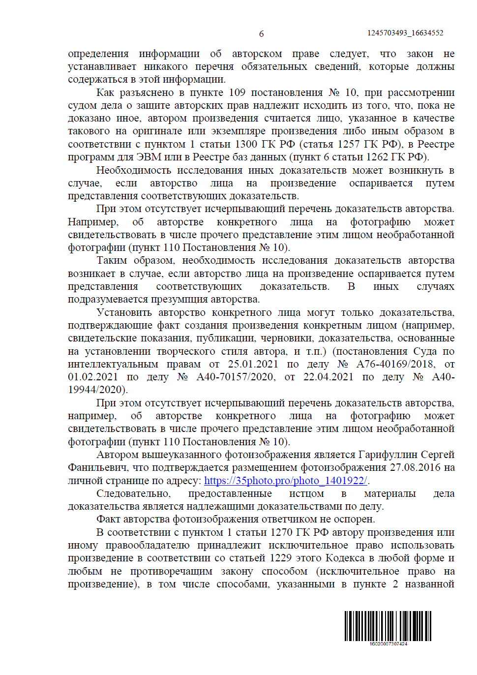 • Фотографии охраняются авторским правом, а автором считается лицо, указанное в качестве автора, пока не доказано иное. Ответчик авторство по существу не опроверг.
