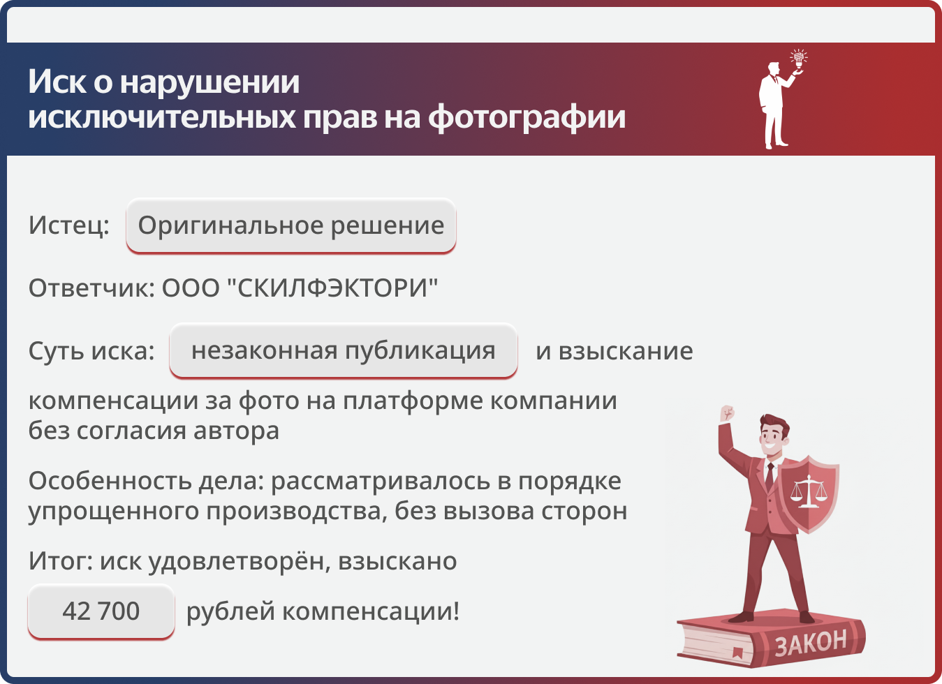 Для авторов этот пример — наглядное подтверждение того, как должна работать современная защита прав. Вам не нужно самостоятельно разбираться с судами и процессуальными нюансами: команду «Оригинального решения» можно подключить на всех этапах — от фиксации нарушения до взыскания компенсации. В результате вы получаете профессиональную защиту, а нарушители — финансовую ответственность, независимо от масштаба компании.