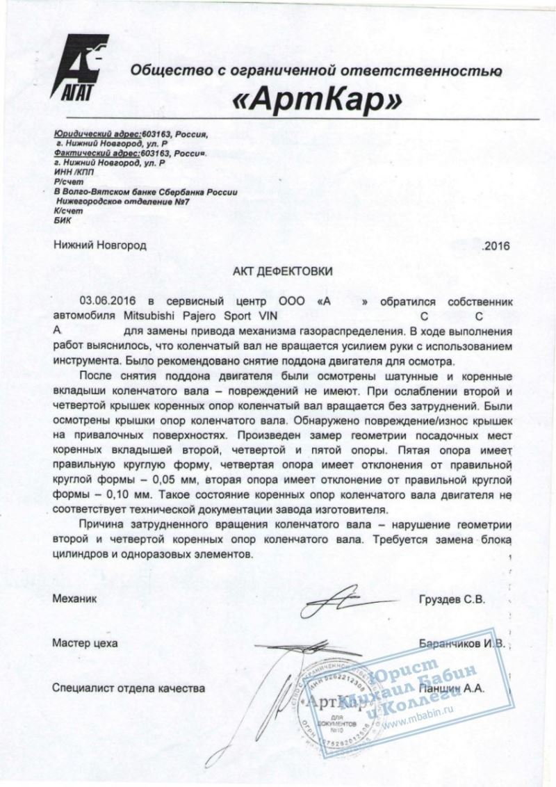 Гражданин С.С. приобрёл в автосалоне автомобиль Mitsubishi Pajero Sport за 1.245.000 рублей. Однако в процессе эксплуатации была выявлена неисправность в коренных опорах коленчатого вала - что являлось фабричным браком.