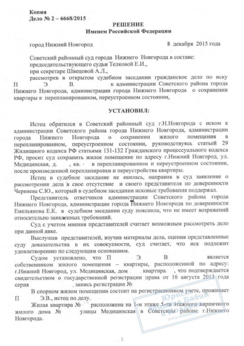 Юрист компании помог Э.П. сохранить квартиру в переустроенном состоянии и узаконить осуществлённую перепланировку через суд.
